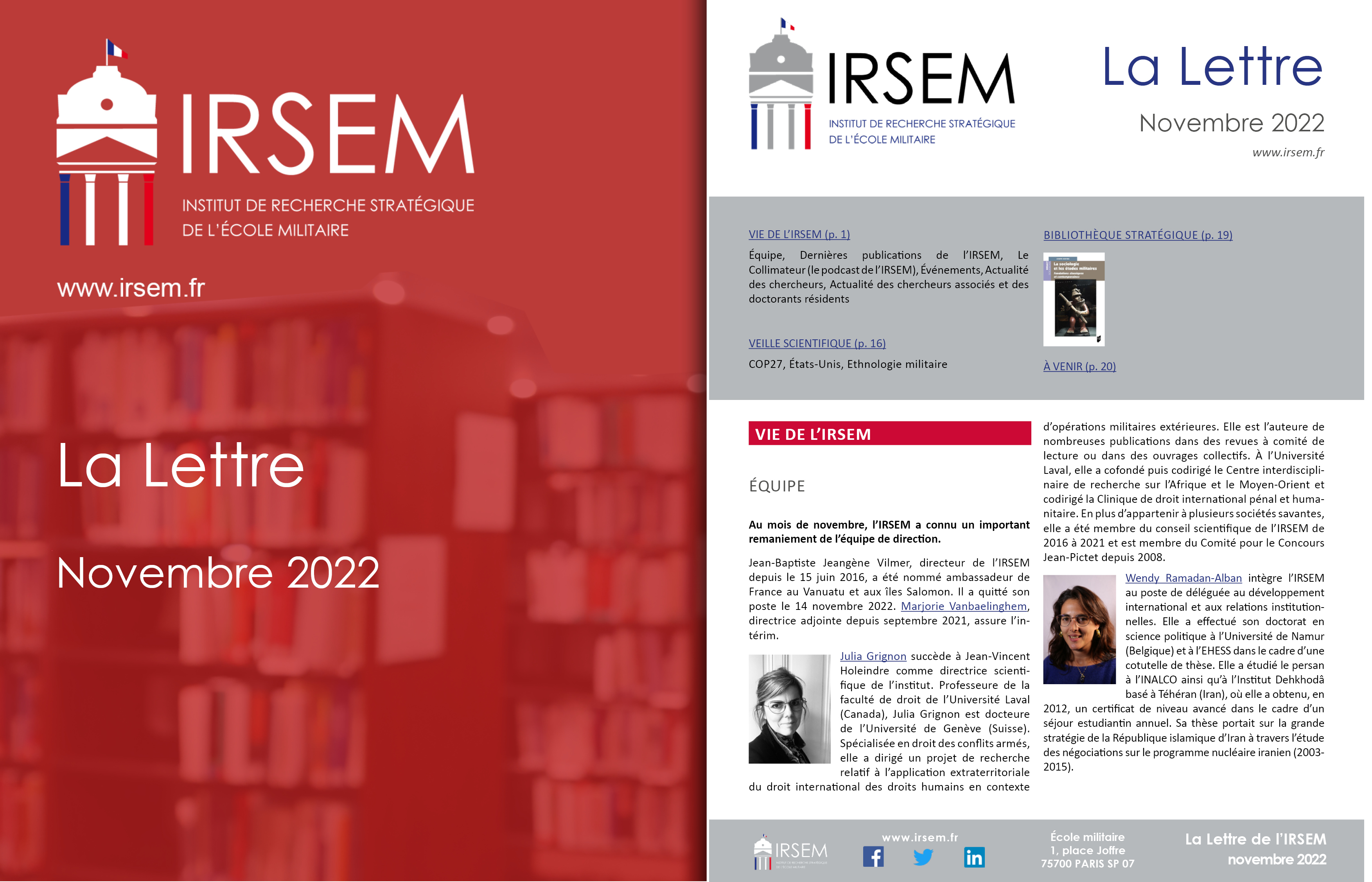 La Lettre de l'IRSEM est notre lettre d'information. Chaque mois, chercheurs résidents et invités y présentent des chroniques et points d'actualité. Vous trouverez dans cette rubrique les liens vers les numéros de chaque collection annuelle.