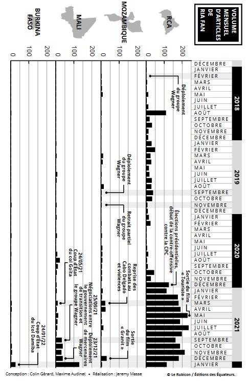 The amount of content devoted to Mali by RIA FAN also illustrates this informational support. Production of content on Mali intensified in several waves in parallel to opportunities opened up by the overthrow of the regime of Ibrahim Boubacar Keita in August 2020 (first wave), by the second coup d’état in May 2021 (second wave), and above all, by the negotiations initiated by the putschist government of Assimi Goïta with Wagner in September 2021. Since the arrival of the Russian mercenaries at the end of December, and against the backdrop of a major diplomatic crisis between Paris and Bamako and the withdrawal of the French army from the country, RIA FAN has published several dozen articles each week about Mali.