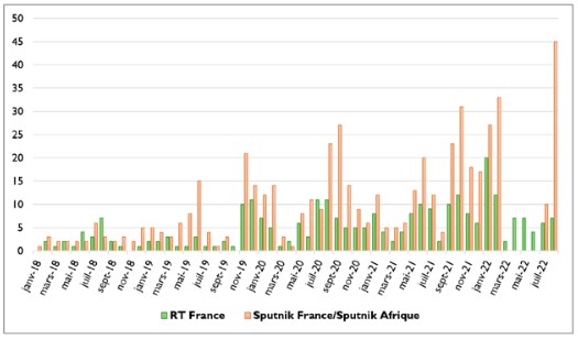 Monthly volume of articles published under the tag “Mali” on the RT France and Sputnik France/Sputnik Afrique websites between January 2018 and August 2022