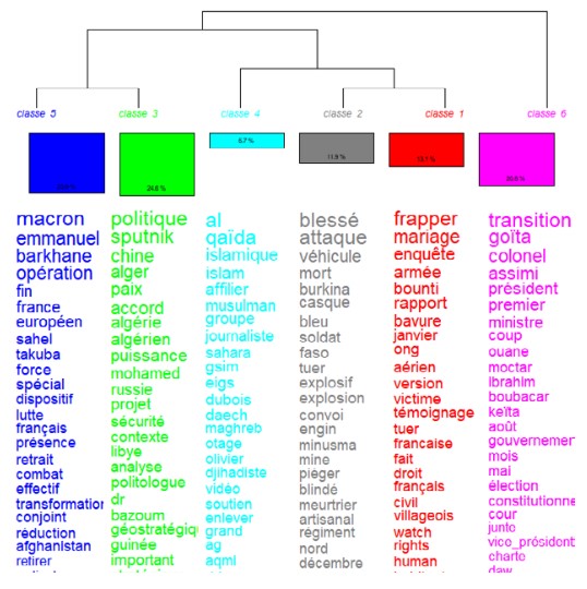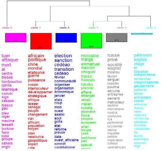 We conclude this textual analysis with the other lexical classes of the second sub-corpus (see Figure 2). Class 1 (27.7% of the classified segments) refers to themes similar to those of class 3 of the first sub-corpus, with additional emphasis on competition between major powers on the African continent. Class 6 (15% of classified segments) corresponds to classes 2 and 4 of the first sub-corpus on the fighting of coalition forces and attacks on French forces; and class 5 (15.6%) continues the topics of Malian interior policy seen earlier, with the appearance of a lot of content on the economic and diplomatic sanctions adopted by ECOWAS against Bamako in early January.
