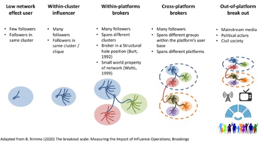 An important framework to assess the diffusion of disinformation is Ben Nimmo’s “Break out scale.”(x) The scale seeks to provide a measure of the success of an information manipulation mainly along the dimensions of whether a piece of disinformation is carried across a single or multiple platforms and whether disinformation is relayed by celebrities or journalists. Nimmo specifically warns that individuals who have a large audience are particularly likely to be the target of information manipulators as they wield a large influence that can be exploited to spread disinformation.