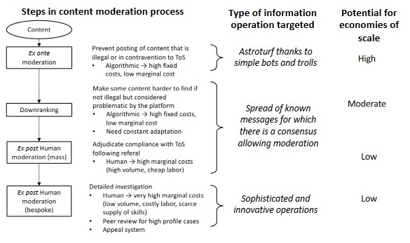 A detailed examination of the content moderation process, consistent with what reporting and leaks has shown, suggests that that process can be very costly to implement and maintain for content-sharing platforms. Moderation seeking to combat disinformation and target instigators of information manipulations exhibits features making it even more resource-consuming than other forms of moderation.