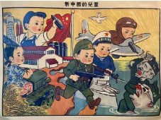 Les enfants de la Chine nouvelle (années 1950) boutent Chiang Kai-shek et MacArthur hors de Taïwan, condition de la paix sur la côte chinoise (la blanche colombe), en usant des trois armes: aviation, marine et troupe. Le tout soutenu par le développement industriel chinois. Vision d’hier à application actuelle, les choses n’ont guère changé. Collection de l’auteur.