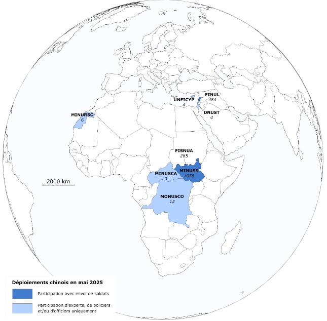 Au 31 mai 2025, la Chine était le 8e plus grand contributeur de troupes aux opérations de paix des Nations unies, et de loin le premier parmi les membres permanents du Conseil de sécurité. Pékin déployait alors 1 855 casques bleus (dont 24 experts, 11 policiers, 44 officiers et 1 776 soldats), répartis entre huit missions (voir carte ci-après). 73,5 % des troupes chinoises étaient déployées sur des théâtres africains, une proportion comparable à celle de l’ensemble des casques bleus déployés par le Département des opérations de paix (DOP) de l’Organisation des Nations unies (ONU). La participation chinoise est néanmoins très concentrée sur le Soudan et le Soudan du Sud : ainsi, sur 1 362 personnels chinois déployés en Afrique, 1 056 (soit 77 %) l’étaient dans le cadre de la Mission des Nations unies au Soudan du Sud (MINUSS), tandis que 285 participaient à la Force intérimaire de sécurité des Nations unies pour Abiyé (FISNUA)(x). Au-delà du Soudan du Sud, la Chine a, au cours des quinze dernières années, également contribué de manière significative à la Mission conjointe des Nations unies et de l’Union africaine au Darfour (MINUAD, dont le mandat s’est achevé en 2020), à la Mission pour la stabilisation en République démocratique du Congo (MONUSCO, en cours de retrait), et à la Mission multidimensionnelle intégrée des Nations unies pour la stabilisation au Mali (MINUSMA).
