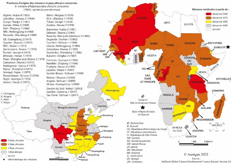 Au total, au moins 30 pays africains (voir carte ci-après) ont été dotés d’une ou plusieurs missions médicales chinoises. Le Mali, par exemple, en comptait quatre (Bamako, Markala, Kati et Sikasso) avant 2011 et leur regroupement au sein de l’« hôpital du Mali », financé et construit par la partie chinoise à Bamako. Cette (re)concentration, verticale, est également visible dans d’autres pays, au Niger notamment. À l’image des fermes d’État chinoises en Afrique dans le domaine agricole, les provinces jouent un rôle important dans la gestion des missions puisque ce sont elles qui ont en charge le personnel et les conventions. Certaines d’entre elles, comme le Sichuan, gèrent jusqu’à cinq partenaires africains.