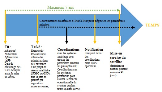 L’UIT vérifie la faisabilité technique du projet au regard des activités spatiales déjà présentes ou en projet, et dont le dossier a déjà été déposé par un ou plusieurs autres États. Le passage par l’UIT permet également d’informer tous les autres utilisateurs ou futurs utilisateurs de filings d’un nouveau projet (c’est l’Advance publication information ou API). Pendant cette période, tous les États souhaitant se coordonner avec ce nouveau projet doivent en faire la demande. Une fois la liste des États établie, le temps est à la coordination (Coordination Request) avec les projets qui existent déjà (qui bénéficient d’une date de dépôt de la demande plus ancienne) et avec tous les États qui auront demandé à se coordonner pour d’autres raisons(x). Le but de la coordination entre États est d’éviter toute interférence entre systèmes. À partir de l’API, le projet est daté. Cette date permettra à l’agence nationale (et donc au demandeur initial) de revendiquer une priorité sur un autre projet demandant les mêmes réservations de filings mais qui serait déposé ultérieurement à l’UIT. Enfin, à partir de cette date, l’opérateur, au travers de l’État, dispose de sept ans pour mettre en orbite son satellite (Figure 1). S’il n’a pas la capacité de mettre en orbite son satellite dans le délai imparti, il perd le bénéfice de sa réservation.