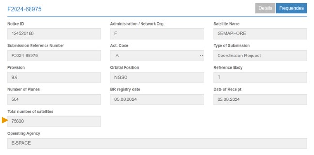 De même, la France a déposé un autre filing appelé « Semaphore » en date du 5 août 2024 pour 75 600 satellites théoriques, au profit d’E-Space et couvrant les bandes de fréquences mobiles (Figure 10).