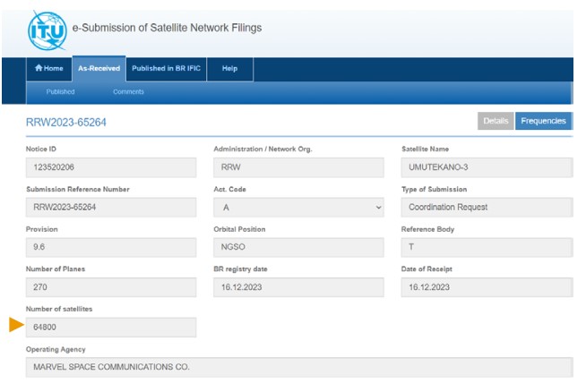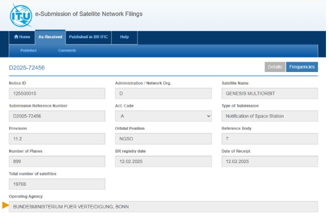 L’Allemagne a de son côté déposé la même demande de réservation de fréquences et positions orbitales que la France sous le nom de « DEUMULTIORBIT » en date du 13 janvier 2024. Cette dernière a également vocation à être partagée avec les 27 États membres de l’UE. Ce deuxième filing, identique à FMS-LEO « pourra servir si besoin(x) », sous-entendu si les Européens n’ont pas la capacité de mettre au moins un satellite de la constellation IRIS² en orbite avant 2027. De plus, en faisant cela, l’Allemagne souhaite apparaître elle aussi comme un acteur majeur de ce projet européen. Enfin, elle a également déposé une autre demande de réservation de couple spectro-orbital sous le nom de GENESIS MULTIORBIT à la même date (13 janvier 2024) (Figure 13).