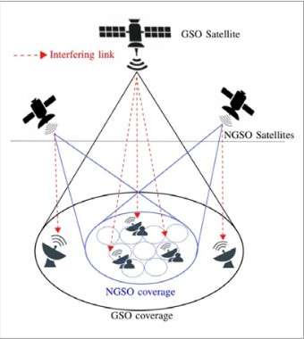 La prolifération des constellations NGSO dans les années à venir risque d’amplifier le phénomène des brouillages préjudiciables. Cela est la conséquence de l’attribution des mêmes bandes de fréquences aux systèmes GSO et NGSO (notamment les bandes Ku et Ka). Ainsi, les risques d’interférences augmentent et peuvent relever de configurations différentes : interférences créées par les liaisons montantes de la station sol GSO vers les satellites GSO et qui affectent le satellite NGSO au passage ; et/ou interférences créées par les liaisons descendantes des satellites NGSO vers leur station sol (Terre) et qui affectent la station sol GSO (Figure 14).