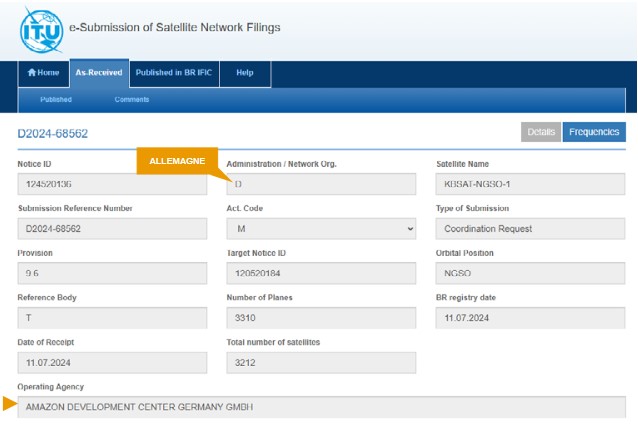 Ainsi, SpaceX a obtenu de l’Allemagne des réservations de fréquences en bande OTAN. SpaceX se serait tout d’abord adressé à l’administration américaine qui aurait refusé cette demande car elle ciblait des bandes OTAN. À l’inverse, l’administration allemande a porté cette demande vers l’UIT. Les filings allemands de Starlink s’appellent MARS-K1, MARS-K2, MARS-E1, MARS-K3, MARS-K4, MARS-VLS, MARS-ULS. MARS-K1, MARS-K2, MARS-K3, MARS-K4 et sont en Ka militaire. Amazon a réalisé la même démarche auprès de l’Allemagne et bénéficie donc en théorie de filings en bande Ka militaire(x) (Figures 15a et 15b).