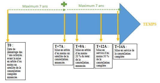 Le phénomène des constellations et notamment des méga-constellations a complexifié le travail de l’UIT. La procédure n’est pas modifiée pour ce qui concerne la demande initiale de réservations de couples. Néanmoins, lors de la Conférence mondiale des radiocommunications de 2019, les États ont décidé que ce qui était valable pour un satellite géostationnaire n’était plus suffisant pour une constellation en orbite basse. Ainsi, il ne suffit plus d’envoyer un seul satellite NGSO dans les sept ans impartis pour obtenir le bénéfice de toutes les réservations demandées. Ces dernières peuvent représenter des milliers voire des dizaines de milliers de positions, selon des plans orbitaux et des altitudes différentes. Il faut à présent que les opérateurs mettent en orbite un premier satellite dans les sept premières années, puis 20 % de la constellation théorique dans les deux ans qui suivent, puis 50 % dans les cinq ans et 100 % dans les sept ans. Par conséquent, l’opérateur/l’État a au maximum sept ans pour mettre en orbite le premier satellite puis sept autres années pour la constellation complète, soit quatorze ans après la déclaration initiale (Figure 2). À défaut, toute assignation de fréquence qui n’est pas mise en service dans le délai requis est annulée par l’UIT (article 11.44 du RR).