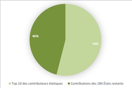 Paradoxalement, même si l’UIT voit son nombre d’adhésions en hausse, son budget n’a pas véritablement augmenté au cours des années. Chaque État participe au budget de l’Union en se fondant sur une valeur fixe inscrite dans la Constitution de l’UIT, l’« unité contributive », qui permet de calculer le montant des adhésions des uns et des autres. L’unité contributive est la contribution obligatoire minimum que les États doivent fournir à l’Union. Elle correspond à 318 000 francs suisses par an(x). Cette valeur est gelée depuis 2006 malgré l’augmentation des salaires au sein de l’UIT(x). À cette unité contributive, s’ajoutent des contributions volontaires. Celle de la France s’élève à 6,3 millions de francs suisses(x), soit 21 unités contributives. En 2024, les quatre principaux contributeurs étatiques de l’UIT étaient les États-Unis (35 unités), le Japon (30 unités), l’Allemagne (25 unités) et la France (21 unités) (Figure 3). De plus, les 10 principaux États contributeurs financent à hauteur de 54 % du budget global. Les 46 % restants sont financés par les 184 États restants (Figure 4).