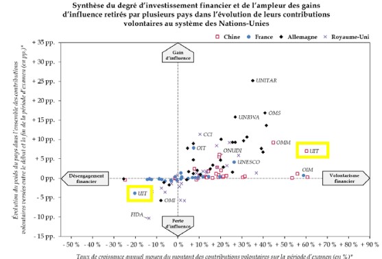 Selon l’UIT, la hausse des contributions volontaires relève davantage pour un État « d’un effort de visibilité que d’influence(x) ». Toujours selon l’UIT, un pays qui souhaite être, de manière générale, plus influent au sein de l’Union renforce d’abord ses équipes techniques nationales afin d’être présent à plus de réunions. Néanmoins, si le niveau de contribution financière est inférieur au niveau de participation aux réunions, ce sont généralement ceux qui contribuent le plus financièrement qui influencent la décision lors de la recherche d’un compromis(x). En effet, la discussion permet certes à l’ensemble des États de se prononcer sur un pied d’égalité eu égard au fonctionnement de l’UIT, mais il n’est pas rare que les représentants des administrations nationales qui contribuent le plus fortement au budget de l’agence pèsent de tout leur poids pour trouver un compromis. De manière implicite, ils font comprendre aux plus « petits » contributeurs qu’il est temps qu’un accord soit trouvé(x). L’influence s’exerce donc par des contributions financières majeures et une présence proportionnelle aux réunions de l’Union.