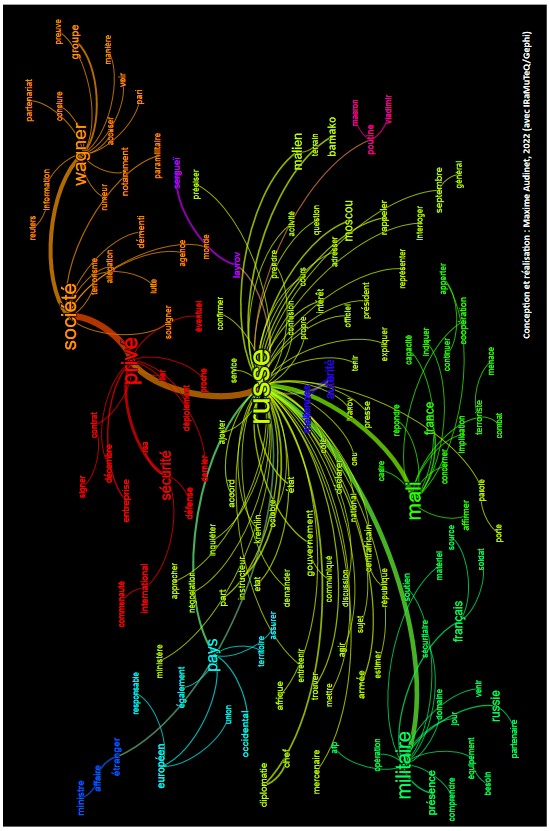 La classe 6, enfin, montre que plus de 20 % des segments issus des articles de RT et Sputnik sur le Mali portent sur l’actualité politique malienne, sur ses élites dirigeantes et sur le régime de « transition » dirigé par le colonel Assimi Goïta, chef de l’État depuis le deuxième coup d’État de mai 2021. Notons que si la notion utilisée par les autorités maliennes de « transition » (214 occurrences) et ses expressions dérivées (« autorités de transition », « gouvernement de transition », « président de transition », etc.) dominent dans le corpus, le terme de « junte », proscrit par le pouvoir compte tenu de sa dimension péjorative, trouve aussi sa place dans le sous-corpus (25 occurrences).