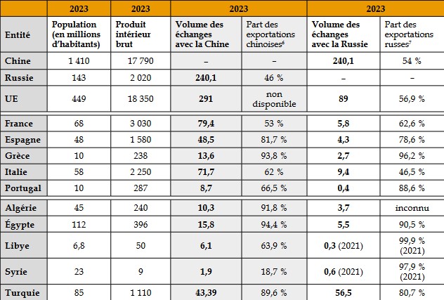 La Chine et la Russie entretiennent avec les États du pourtour de la Méditerranée des relations commerciales nourries et souhaitent tirer davantage profit de leur potentiel économique. Si Pékin est beaucoup mieux doté que Moscou pour remplir cet objectif, leur expansion économique dans la région semble pour l’instant ne pas se faire au détriment de l’autre. Toutefois, les disparités de puissance économique qui s’accentuent depuis le début de la guerre en Ukraine donnent un avantage certain à Pékin dans la région. Ayant un PIB près de neuf fois supérieur à celui de la Russie, la Chine entretient des relations commerciales sans commune mesure avec les pays riverains de la Méditerranée, à l’exception notable de la Turquie.