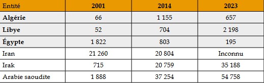 Depuis le début du XXIe siècle, et plus encore depuis le lancement du projet des routes de la soie terrestres et maritimes par Xi Jinping, la Méditerranée est devenue une région primordiale pour les intérêts économiques chinois car elle peut absorber les surplus de production chinois et participer au maintien de la croissance économique du pays(x). Les États membres de l’Union européenne (UE) y sont ses premiers partenaires commerciaux(x) ; l’Europe centrale et les Balkans représentent des marchés en devenir, tout comme les États du Moyen-Orient ; la Syrie promet des bénéfices pour une reconstruction après guerre. De nombreux États de l’Europe du Sud (Espagne, Grèce, Turquie, Italie) sont des économies à revenus intermédiaires et constituent des débouchés pour les produits chinois, y compris de haute technologie, quand d’autres sont susceptibles d’améliorer ses capacités (Israël, Turquie). Sur les 19 États riverains de la Méditerranée, 14 ont signé des mémorandums pour adhérer au projet des routes de la soie entre 2015 et 2022. La Turquie a été le premier pays de la région à adhérer au projet chinois, tandis que la Syrie est le dernier, ouvrant de nouvelles perspectives pour la Chine dans ce pays qui, selon son président, Bachar el-Assad, fait historiquement partie de la route de la soie(x). La région méditerranéenne est aussi la seule où un État a quitté ces mêmes accords : l’Italie qui y avait adhéré en 2019 a décidé d’en sortir en 20234, rejoignant la France, l’Espagne, le Liban et Israël comme États méditerranéens non membres des routes de la soie. La Chine s’approvisionne en énergie auprès de trois États méditerranéens, l’Algérie, la Libye et l’Égypte, alors que ses principaux fournisseurs sont l’Arabie saoudite, l’Iran et l’Irak. Comme le montrent les données du tableau 2, les importations de la Chine en énergie ont augmenté au rythme des besoins engendrés par sa croissance économique. L’Égypte est le seul État qui depuis 2001 a vu la valeur des importations chinoises énergétiques baisser de presque 90 %, passant de 1 822 millions de dollars à 195 millions. Au contraire, sur la même période, la Libye a vu le montant des importations énergétiques chinoises multiplié par 42, et ce en dépit des difficultés internes de 2011. Ces valeurs restent très en dessous de celles de l’Iran, de l’Irak et de l’Arabie saoudite. En 2023, ces deux derniers annonçaient, respectivement, un montant de 35 188 millions et 54 758 millions de dollars.