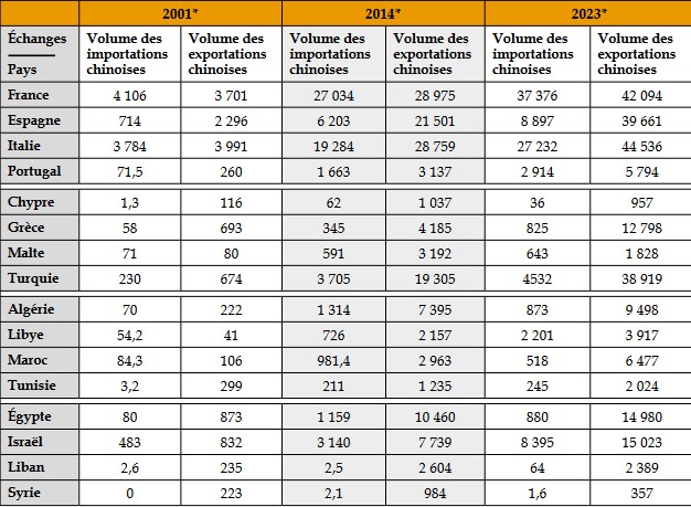 Tableau 3 Évolution des échanges commerciaux de la Chine avec les pays méditerranéens (en millions de dollars)(x)