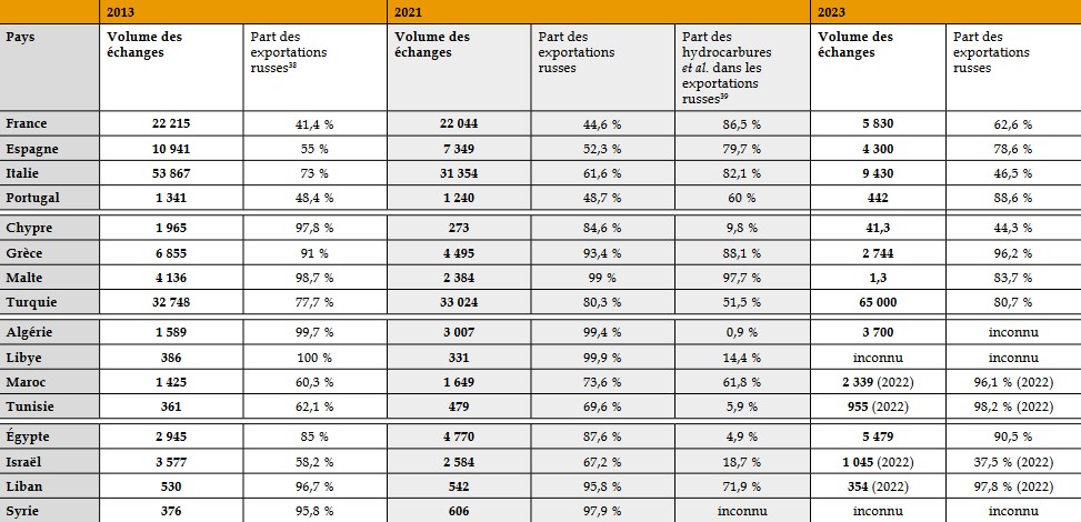 Au nord de la Méditerranée, où les échanges commerciaux étaient souvent dominés par les ventes d’hydrocarbures russes, les positions commerciales de la Russie sont partout, à l’exception de la Turquie, en net recul depuis l’invasion de l’Ukraine. Les pays riverains de la Méditerranée membres de l’UE, la France, l’Espagne, l’Italie, le Portugal, la Grèce, Chypre et Malte, appliquent la politique européenne de sanctions à l’égard de la Russie, notamment sur le pétrole. On observe une réduction drastique des échanges, les cas les plus édifiants étant, comme le montre le tableau 4, Malte avec lequel le volume des échanges est passé de 2 384 millions de dollars en 2021 à 1,3 million en 2023 ou encore l’Italie avec laquelle le volume des échanges est passé de 22 milliards à 5,8 milliards sur la même période, alors que la part des hydrocarbures et autres produits minéraux représentait 82,1 % des exportations russes dans le pays en 2021.