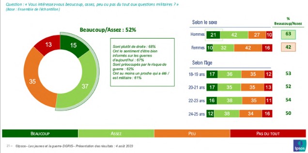 Cependant la différence la plus notable est due à un effet de genre : les jeunes hommes se déclarent en plus grand nombre comme étant bien informés (61 %) tandis que les jeunes femmes ne sont plus que 37 % à faire la même réponse (soit un écart de –24 points). On retrouve un écart lié au genre en ce qui concerne l’intérêt porté aux questions militaires. Les jeunes femmes sont toujours plus en retrait : 42 % des jeunes femmes déclarent leur intérêt contre 63 % des jeunes hommes.