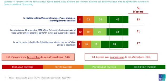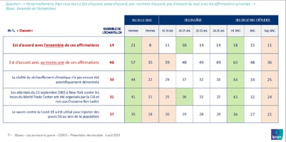D’autres affirmations portant sur l’environnement (remise en cause du réchauffement climatique) et la Covid (vaccin utilisé pour injecter des puces 5G à la population), visaient à tester la pénétration des idées complotistes. Dans les deux cas c’est environ un jeune sur trois qui souscrit à chaque interprétation complotiste proposée.