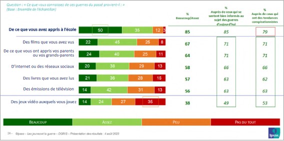 Interrogés sur les vecteurs de leurs connaissances sur ces guerres du passé, les jeunes mettent en avant le rôle de l’école, loin devant les films, les médias ou le témoignage des proches. Ainsi 85 % d’entre eux évoquent les apprentissages scolaires, parmi lesquels 50 % reconnaissent que ce qu’ils ont appris sur ces guerres, ils le doivent beaucoup à l’école, et les plus jeunes davantage que les plus âgés (57 % des 18-19 ans contre 42 % des 24-25 ans). Le cinéma arrive en deuxième position mais nettement derrière : 67 % reconnaissent son rôle dans la connaissance qu’ils ont de ces guerres, parmi lesquels 22 % disent lui devoir beaucoup. Le rôle de la famille est équivalent : 64 % admettent que leurs savoirs en la matière sont dus à leurs parents ou à leurs grands-parents (parmi lesquels 24 % beaucoup). Internet, les réseaux sociaux d’une part et les émissions de télévision d’autre part sont évoqués par respectivement 58 % et 56 % des jeunes, ce qui est loin d’être négligeable. La culture livresque quant à elle est mentionnée par 57 % d’entre eux. L’importance des livres est avérée. Enfin, les jeux vidéo arrivent nettement plus loin derrière : 38 % les évoquent comme vecteurs de savoirs sur les guerres du passé.