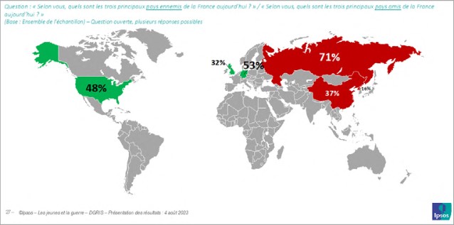 Qui dit guerre dit confrontation entre des nations ou des coalitions de nations. Les jeunes étaient invités à désigner de façon libre ce qu’ils pensaient être les trois principaux pays « ennemis » et les trois principaux « amis » de la France aujourd’hui. En ressort une cartographie géopolitique relativement sans surprise et indéniablement assez sommaire mais révélatrice de la perception qu’ils peuvent avoir à la fois des tensions existantes entre les grandes puissances se partageant la planète et de la réalité conjoncturelle des conflits actuels ou potentiels dans le monde d’aujourd’hui.