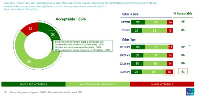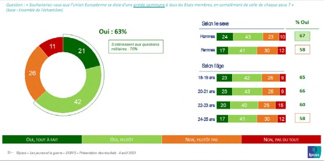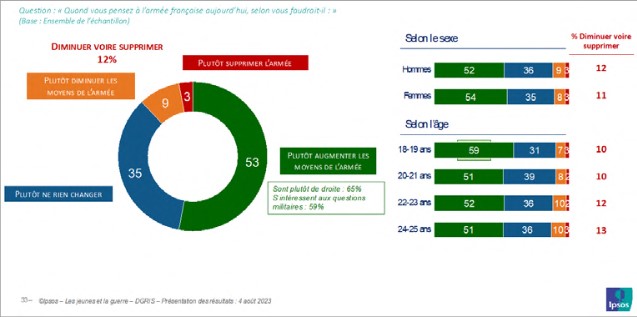 C’est à l’aune de ces évolutions qu’il faut interpréter l’assentiment d’une majorité de jeunes à l’augmentation des moyens de l’armée française : 53 % des jeunes s’y rallient, et l’on n’en dénombre que 9 % pour dire qu’il faut plutôt diminuer les moyens de celle-ci et seulement 3 % qui affirment vouloir supprimer l’armée.