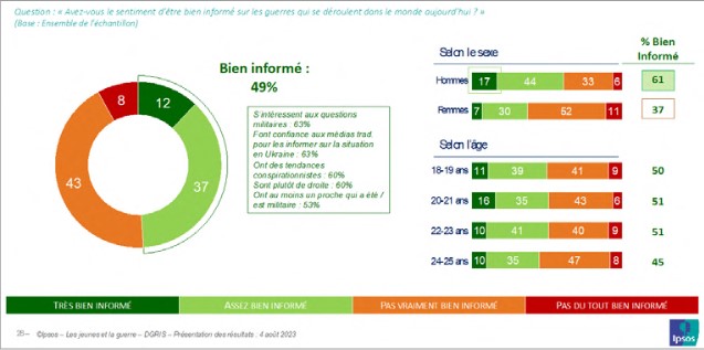 Le niveau d’information des jeunes sur les guerres qui se déroulent dans le monde aujourd’hui présente certaines faiblesses. Seul un jeune sur deux (49 %) a le sentiment d’être bien informé, et parmi eux seuls 12 % se considèrent comme très bien informés. C’est donc aussi en miroir un jeune sur deux qui reconnaît ne pas être vraiment bien informé ou pas informé du tout. Sans surprise, les jeunes s’intéressant aux questions militaires disposent d’un niveau d’information supérieur à la moyenne (63 %).