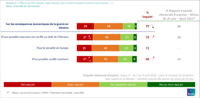 Les représentations que les jeunes générations ont de la guerre s’inscrivent donc dans un contexte plutôt favorable à l’institution militaire et aux armées françaises, dans le cadre d’une alliance atlantique mais aussi européenne, l’idée de défense européenne étant majoritairement intégrée. Néanmoins elles témoignent indéniablement d’une perception mortifère qui entretient une grande inquiétude à l’égard de conflits majeurs pouvant intervenir sur le territoire. Dans une proportion équivalente à celle que l’on mesure dans l’ensemble de la population française, 77 % des 18-24 ans se disent inquiets du climat et de l’atmosphère qui règne en France depuis l’attaque du Hamas en Israël le 7 octobre 2023 et 68 % considèrent qu’il existe un risque que ce conflit s’élargisse à d’autres pays, notamment le Liban et l’Iran(x).