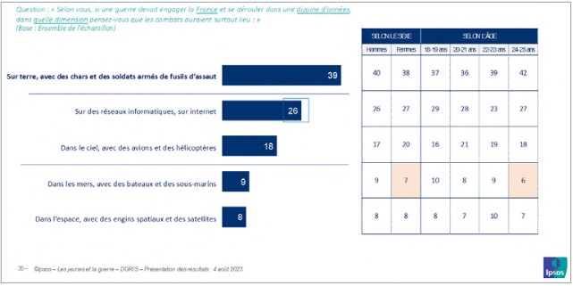 C’est une vision relativement traditionnelle des combats et de leurs techniques qui s’impose. En effet, c’est en premier lieu l’armée de terre qui est convoquée : 39 % des jeunes interrogés considèrent que les combats auraient lieu sur terre avec des chars et des soldats armés de fusils d’assaut. La seconde place revient à la guerre numérique. Un quart des jeunes (26 %) imagine que les combats se dérouleraient surtout sur des réseaux informatiques et sur internet. Les autres corps d’armée ne viennent que loin derrière. Seuls 18 % envisagent une guerre dans le ciel avec des avions et des hélicoptères, et une infime minorité (8 %) la perspective d’une guerre dans l’espace avec des engins spatiaux et des satellites.