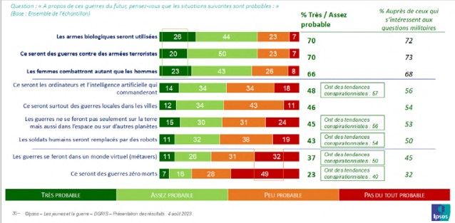 L’élargissement des territoires de la guerre à l’espace est envisagé par une proportion non négligeable de jeunes. Ainsi 45 % pensent que les guerres ne se feront pas seulement sur la terre mais aussi dans l’espace ou sur d’autres planètes, cette perception n’étant pas sans convoquer les représentations imaginaires véhiculées entre autres par la saga iconique Stars Wars. Ils sont aussi nombreux à imaginer que les guerres se dérouleront sur des théâtres urbains : 46 % souscrivent à l’idée qu’il est probable que ce seront surtout des guerres locales dans des villes. Le modèle de la guérilla urbaine est présent.