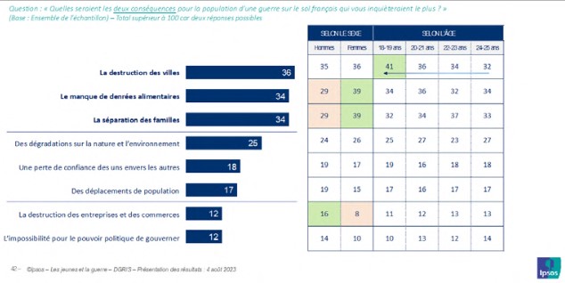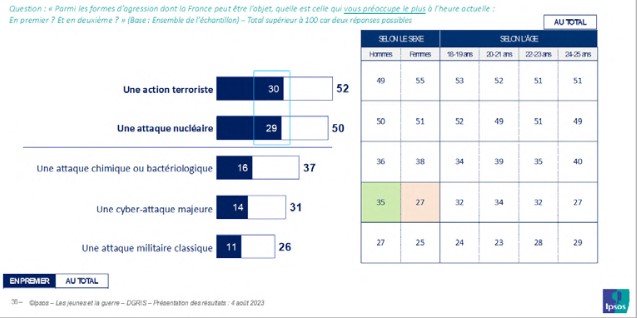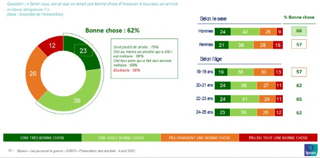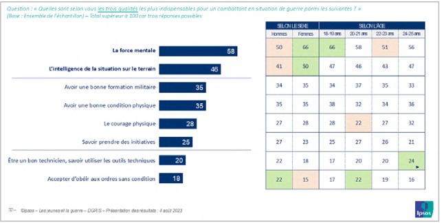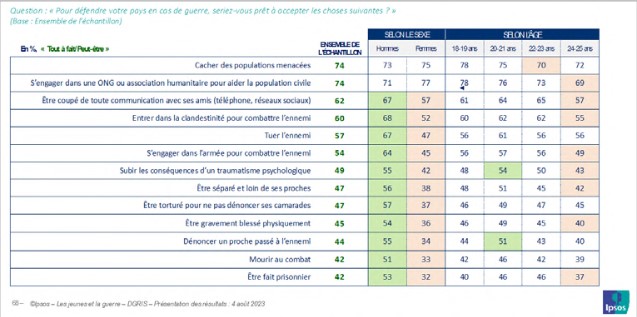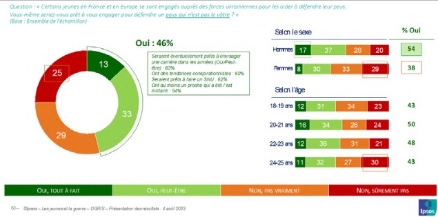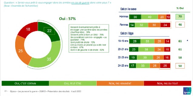 Du reste, l’idée que la guerre peut ne pas être la seule affaire des militaires est partagée par une proportion significative de jeunes : si une large majorité (58 %), et les jeunes hommes davantage que les jeunes femmes (60 % contre 55 %), se rallie à l’idée que la guerre doit être faite seulement par les militaires, 42 % d’entre eux, et en plus grand nombre les jeunes femmes (45 % contre 40 % des jeunes hommes), considèrent que la guerre doit être faite par chaque citoyen si on lui en donne les moyens.