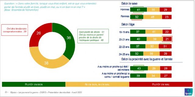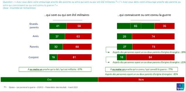 L’importance de la famille dans la transmission des valeurs et dans la fabrique des opinions est avérée. En matière de socialisation militaire, les jeunes Français d’aujourd’hui disposent, dans leur famille et leur entourage proche, de contacts et de relations avec des personnes directement concernées par la vie militaire ou par la guerre. Ainsi les deux tiers d’entre eux (67 %) ont-ils au moins un proche qui a été ou est actuellement militaire et les trois quarts (77 %) au moins un proche qui a connu ou connaît la guerre. Cette dernière proportion grimpe à 81 % lorsque les jeunes ont un ou deux parents d’origine étrangère. Le travail de Paul Max Morin sur les jeunes et la guerre d’Algérie avait pu mesurer que 39 % des jeunes Français avaient un lien familial avec cette histoire, entretenant de fait un lien intime avec elle(x). Les récits de mémoire véhiculés dans les familles jouent un rôle important dans les représentations de la guerre qui se transmettent dans la dynamique des générations.