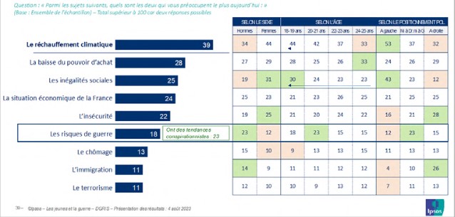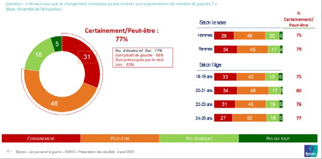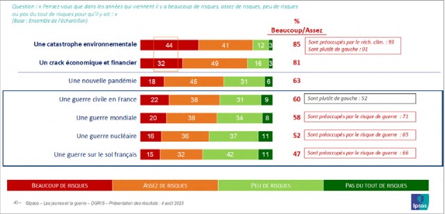 Si les deux tiers d’entre eux se projettent de façon optimiste en ce qui concerne leur avenir personnel, ils envisagent avec davantage de pessimisme l’avenir de la société française. Plus d’une moitié d’entre eux se range en faveur de ce dernier constat. Les jeunes identifient les menaces qui pèsent sur la France dans les années qui viennent, au rang desquelles se trouvent les guerres sous toutes leurs formes ; toutefois c’est le risque climatique et environnemental qui est pour eux le plus important et le plus crucial. Ils ne sont pas sans faire le lien entre les conséquences du réchauffement climatique et un accroissement des risques de guerre dans un avenir proche.
