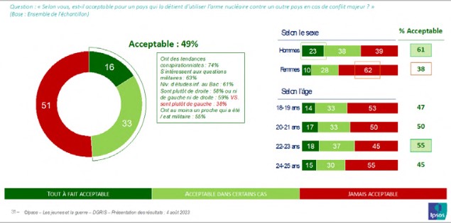 Malgré ces différences d’appréciations et d’opinions qui indiquent des clivages significatifs au sein de la population juvénile, on retiendra une levée relative de la réticence envers l’usage de l’arme nucléaire dans le renouvellement générationnel. Un jeune sur deux ne présente guère de réserve quant à son usage. Leur perception des menaces de guerre grandissantes dans un nouvel ordre mondial peut expliquer l’importance de cette proportion. L’éloignement temporel du traumatisme des effets des bombes atomiques lâchées par l’armée américaine sur Hiroshima et Nagazaki en 1945 n’est pas non plus sans incidence.