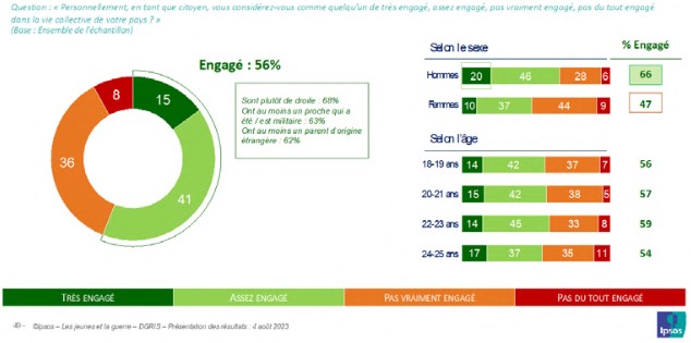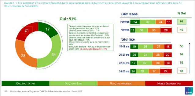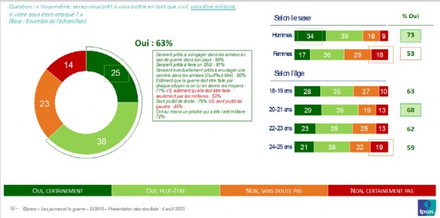 Ces chiffres vérifient la consistance du lien armée-nation qui, bien qu’affaibli, n’a pas disparu. Ils laissent penser qu’en cas de conflit majeur, le pays pourra compter sur la résilience des jeunes générations. Leur disposition et leur disponibilité à un engagement dans les armées en cas de guerre en France concernent une large majorité des jeunes interrogés (57 %) : sept jeunes hommes sur dix (70 %) et près d’une jeune femme sur deux (46 %). Par ailleurs, près des deux tiers (63 %) d’entre eux seraient même prêts à se battre en tant que civils, sans être militaires, si leur pays était attaqué. Plus du tiers des jeunes hommes (33 %) et 17 % des jeunes femmes en sont certains. Les plus jeunes sont souvent plus affirmatifs que dans la tranche d’âge des 24-25 ans, mais il existe un vivier de mobilisation potentielle important dans l’ensemble de la population juvénile.
