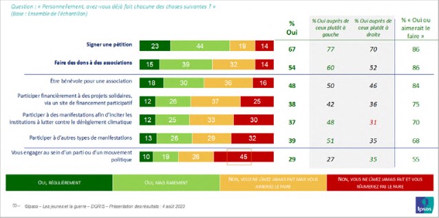 L’engagement reste un repère qui fait sens dans les représentations que les jeunes ont de la citoyenneté et de la part que chacun d’eux peut prendre pour la faire vivre et la rendre utile à la société. Il fait sens non seulement en termes de valeur et de disposition personnelle, mais aussi de pratiques concrètes tant sur le plan individuel que collectif. Et cela semble se vérifier jusque dans les formes les plus extrêmes de l’engagement dans un conflit majeur tel qu’une guerre. Pourtant, des dispositions au passage à l’acte, l’engagement n’obéit pas nécessairement à un continuum linéaire, et certains segments de la jeunesse peuvent témoigner d’une velléité moindre.