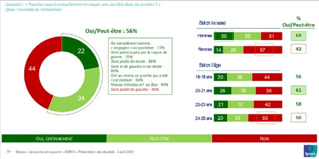 Dans notre enquête, une majorité des jeunes (56 %) indique pouvoir éventuellement envisager une carrière dans les armées, notamment les jeunes hommes (69 % contre 43 % des jeunes femmes). Il faut remarquer toutefois l’importance relative de cette disposition au sein de la population féminine, plus d’une jeune femme sur quatre (43 %) dont 14 % se disent sûres de leur choix. C’est moitié moins que les jeunes hommes (30 %) mais ce n’est pas négligeable étant donné la plus grande réticence des femmes vis-à-vis de l’univers de la guerre et des armées.