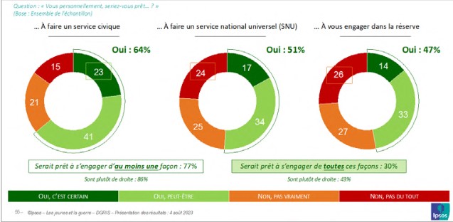 Il existe donc une réelle attractivité de ces engagements tournés en priorité au service de la nation concourant à l’entretien d’une forme de solidarité collective, sinon de patriotisme, dans une partie significative des jeunes générations. Plus des trois quarts des jeunes (77 %) se disent prêts à s’engager au moins selon une de ces façons, et 30 % le seraient pour ces trois façons, et ce de manière plus marquée parmi les jeunes se positionnant à droite (respectivement +9 points et +13 points par rapport à l’ensemble des jeunes). Le service civique est indéniablement le plus attractif, non seulement pour sa composante sociale et associative mais aussi parce qu’il est une étape prise en compte dans le parcours d’insertion professionnelle et économique des jeunes et est rémunéré pendant une période de sept mois. Les femmes se montrent plus en retrait de toute velléité d’engagement dans le champ militaire (SNU et réserve), mais leur disponibilité reste significative (entre trois et quatre d’entre elles sur dix y sont disposées).