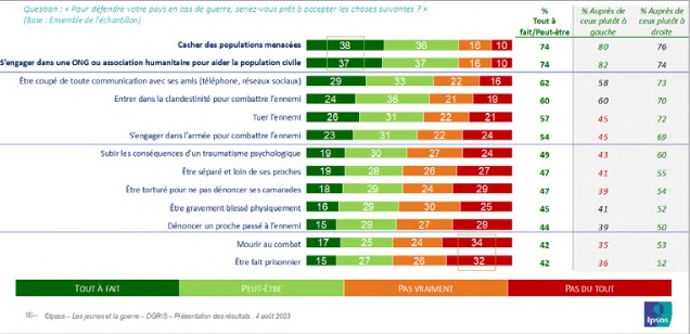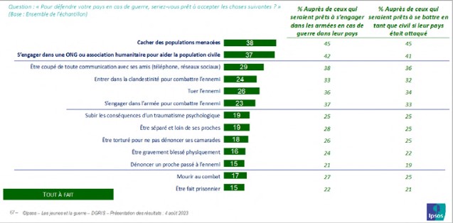 Les jeunes qui déclarent être tout à fait prêts à s’engager en cas de guerre dans leur pays, soit en tant que militaires, soit en tant que civils, se montrent potentiellement toujours plus prêts aussi à endurer les diverses circonstances évoquées. L’engagement suppose d’endosser les conséquences auxquelles il peut exposer, y compris dans ses aspects les plus dramatiques et tragiques.