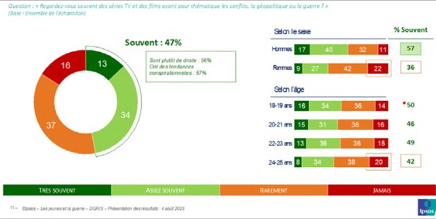 Dans le palmarès des films les plus regardés, la première place revient à Top Gun, du réalisateur Joseph Kosinski, sorti en France en mai 2022, sur les aviateurs de la Marine. En effet, les trois quarts des jeunes (73 %) l’ont visionné, autant les jeunes hommes que les jeunes femmes. Vient ensuite Apocalypse Now, de Francis Ford Coppola, réalisé en 1979, qui, lui, a été davantage regardé par les jeunes hommes (51 % contre 45 % des jeunes femmes), et davantage aussi par les 24-25 ans (51 % contre 44 % des 18-19 ans). Trois films ou séries s’imposent ensuite : Le Chant du loup, un film réalisé par Antonin Baudry en 2019, la série française Le Bureau des légendes d’Eric Rochant, dont le premier épisode a été diffusé en 2015, et Homeland, une série américaine de Howard Gordon, Alex Gansa et Gideon Raff, dont le premier épisode a été diffusé en 2011 et le dernier en 2020. Cette dernière série a été regardée autant par les jeunes femmes que par les jeunes hommes, tandis que Le Chant du loup et Le Bureau des légendes ont eu un public plus masculin. Plusieurs autres réalisations font aussi partie du paysage audiovisuel des jeunes : les séries Band of Brothers, Kalifat, Téhéran, Fauda et When Heros Fly, ont été visionnées par respectivement 34 %, 32 %, 30 % et 29 % des jeunes, et surtout par les jeunes hommes.