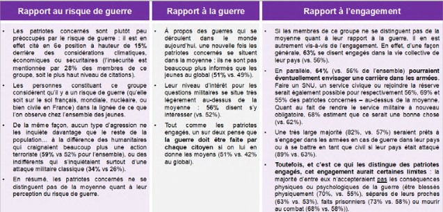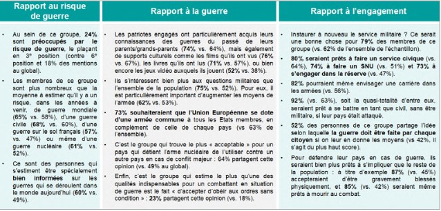 Le premier groupe, les patriotes engagés, représente 35 % des jeunes. C’est celui qui réunit le plus grand nombre de jeunes. Les jeunes se classant dans ce groupe se caractérisent par une perception aiguë du risque de guerre dans les années qui viennent et par une disposition affirmée à l’engagement dans les armées, impliquant une plus grande acceptabilité des conséquences physiques et psychologiques pouvant en découler en cas de conflit majeur. Ils sont nettement plus enclins que les autres à envisager la possibilité d’être blessés ou de mourir au combat. Ce groupe rassemble en plus grand nombre des jeunes hommes, issus en majorité des catégories populaires, et témoignant d’une orientation idéologique plutôt à droite ou ni à gauche ni à droite.