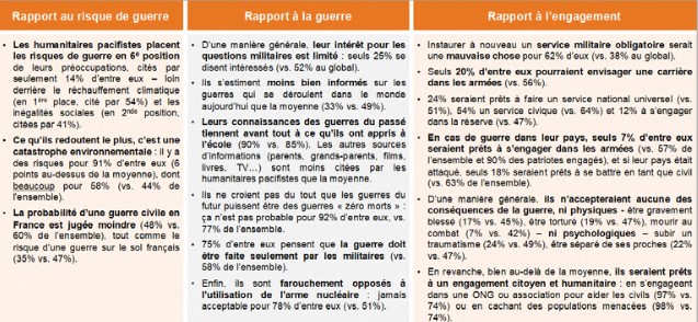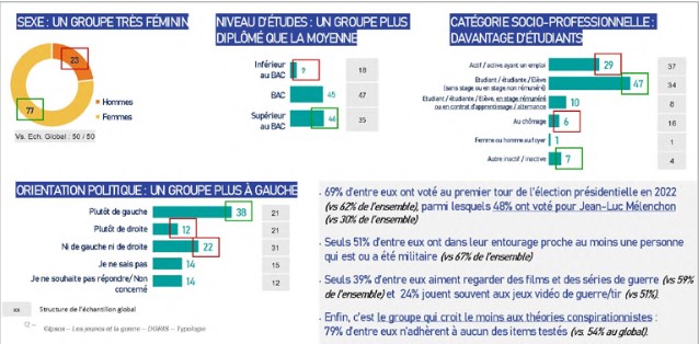 Le troisième groupe, les humanitaires pacifistes, se caractérise par sa propension à l’engagement – un engagement citoyen et humanitaire pour aider en premier lieu la population civile mais pas militaire. Il rassemble 19 % de la population interrogée, soit un jeune sur cinq, se montrant davantage préoccupé par le risque climatique, les catastrophes environnementales, ou encore par les inégalités sociales, que par la menace de guerre. Les jeunes appartenant à ce profil s’intéressent peu aux questions militaires. C’est un groupe majoritairement féminin, sensiblement plus diplômé, et plus à gauche que l’ensemble des jeunes.