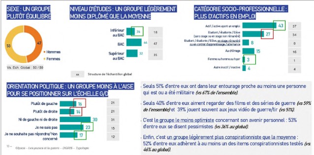 Elle s’appuie sur une enquête quantitative inédite menée en ligne auprès d’un large échantillon représentatif de la jeunesse française âgée de 18 à 25 ans (n=2301) et établit un ensemble de résultats permettant de répondre à ces interrogations. Elle fournit aux armées un cadre d’interprétation des attitudes et des opinions les plus significatives dans les jeunes générations au sujet de la guerre(x). Dans le champ de la sociologie militaire comme dans le champ des études sur la jeunesse, c’est un sujet qui a été peu exploré et qui pourtant, en raison des reconfigurations internationales des conflits et de la diffusion des menaces hybrides auxquelles les armées comme les populations sont confrontées, est plus que jamais d’actualité.