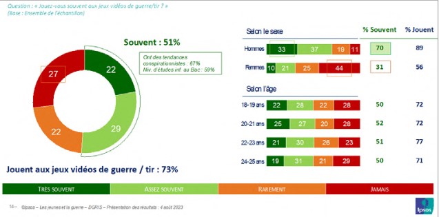 Les jeunes sont donc plutôt consommateurs de contenus liés à la guerre ; leur intérêt se porte aussi, et ce tout particulièrement dans la population masculine, sur les jeux vidéo de tir et de guerre. Un jeune sur deux (51 %) déclare y jouer souvent, et si l’on ajoute ceux qui reconnaissent y jouer rarement, ce sont les trois quarts des jeunes (73 %) qui jouent sur ce type de support (89 % des jeunes hommes). Si les femmes sont nettement moins attirées par cette pratique ludique, plus de la moitié d’entre elles (56 %) déclarent tout de même y jouer au moins rarement, et un petit tiers (31 %) souvent.