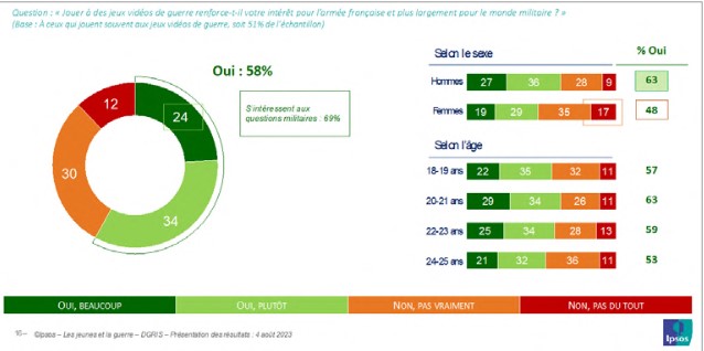 Cette activité ludique informe sur l’univers militaire. Elle est susceptible de rapprocher les jeunes du monde militaire et de renforcer leur intérêt pour l’armée française. C’est ce que pense une large majorité de ceux qui reconnaissent y jouer souvent (58 %), et près des deux tiers (63 %) des gamers masculins. En ce sens, il est indéniable que ces jeux occupent une place importante dans les vecteurs de socialisation militaire.