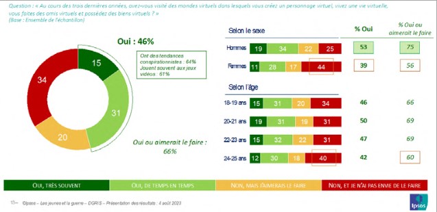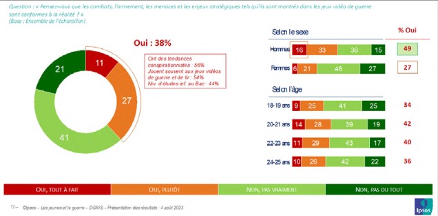 Les jeux vidéo permettent au joueur de circuler à sa guise dans un univers complexe, où il va interagir avec des éléments, des situations et des protagonistes de l’histoire dans laquelle il est embarqué. En ce sens, tout comme les jeux de rôle, ils sont porteurs de valeurs, de discours, d’actions et de visions du monde(x). La publicité récente, diffusée sur les réseaux sociaux et lancée à l’initiative de la gendarmerie en vue de recruter les jeunes en s’inspirant des codes du jeu Call of Duty, témoigne de l’influence que peuvent avoir ces jeux dans la vie réelle, y compris au sein de l’institution militaire. Cet usage a pu être discuté et n’est pas sans faire polémique parmi les internautes(x). Cependant il est révélateur de l’influence que peuvent avoir les jeux vidéo non seulement sur les imaginaires mais aussi sur l’appréhension des réalités de la guerre. La frontière entre le virtuel et le réel peut même apparaître ténue. Ainsi, ce sont quatre jeunes sur dix (38 %), et un jeune homme sur deux (49 %) qui considèrent que les combats, l’armement, les menaces et les enjeux stratégiques tels qu’ils sont montrés dans les jeux vidéo de guerre sont conformes à la réalité. Cette proportion grimpe à 54 % parmi les jeunes qui jouent à des jeux vidéo de guerre.