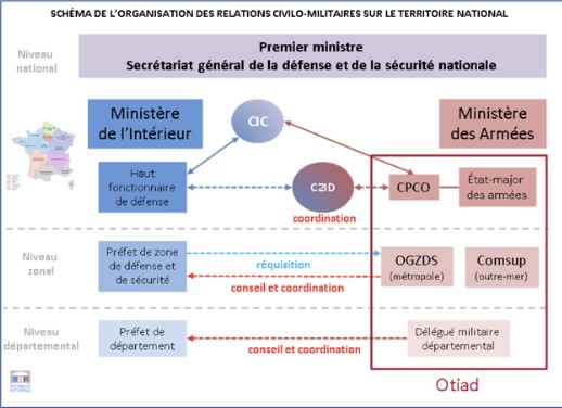 La chaîne OTIAD est le cadre dans lequel s’organise la coordination des moyens civils et militaires de défense du territoire.